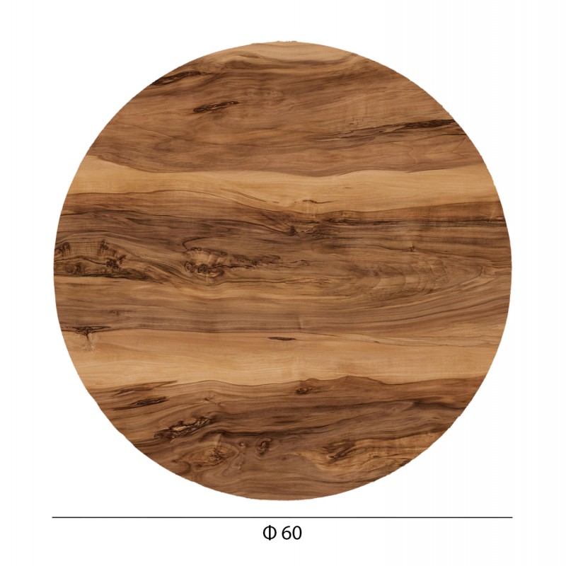 Στρογγυλή φαλτσοκομμένη επιφάνεια τραπεζιού σε χρώμα INDIAN SHESHAM, η οποία είναι κατάλληλη για επαφή με τρόφιμα και γενικά το υλικό είναι φιλικό προς το περιβάλλον. Μπορεί να χρησιμοποιηθεί σε πληθώρα χώρων όπως καφετέριες, εστιατόρια, και τουριστικά καταλύματα, είτε σε εσωτερικούς, είτε σε εξωτερικούς χώρους.