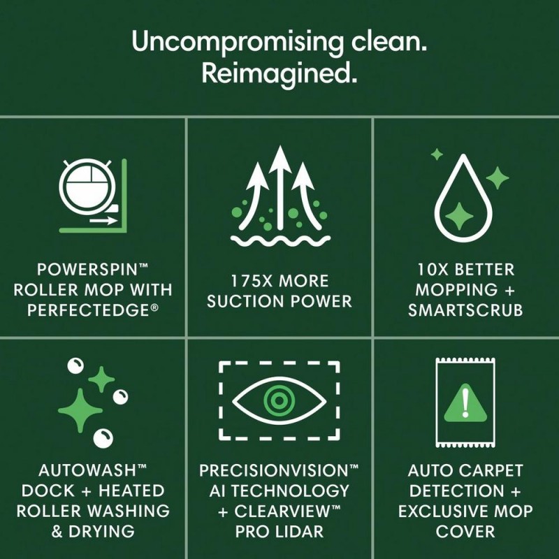 από τρίχες κατοικίδιων ζώων μέχρι λεκέδες καφέ με την αυτοκαθαριζόμενη σφουγγαρίστρα PowerSpin™ Roller με PerfectEdge®, θερμαινόμενο σφουγγάρισμα, SmartScrub, 175 φορές περισσότερη αναρρόφηση 1 , διπλές βούρτσες από καουτσούκ και βούρτσες σάρωσης διπλής ακμής.