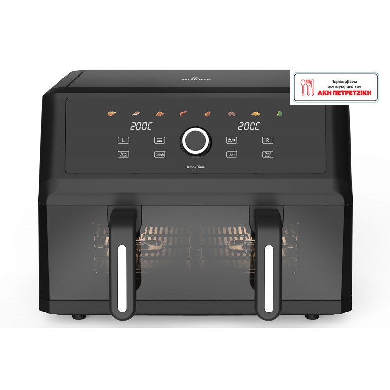 Φριτέζα αέρος XXXL της Morris. Με μεγάλη χωρητικότητα 10,4 λίτρα και δυνατότητα χρήσης είτε ως ενός ενιαίου χώρου (single zone) είτε ως 2 ανεξάρτητων (dual zone) για ξεχωριστό μαγείρεμα. Με τη λειτουργία Sync υπάρχει η δυνατότητα ρύθμισης ολοκλήρωσης ψησίματος διαφορετικών φαγητών με διαφορετικές θερμοκρασίες ή/και ρυθμίσεις την ίδια ώρα. Διαθέτει αφαιρούμενο κάδο ΧXXL και βάση ψησίματος με κεραμική επίστρωση για ευκολία στο καθάρισμα!