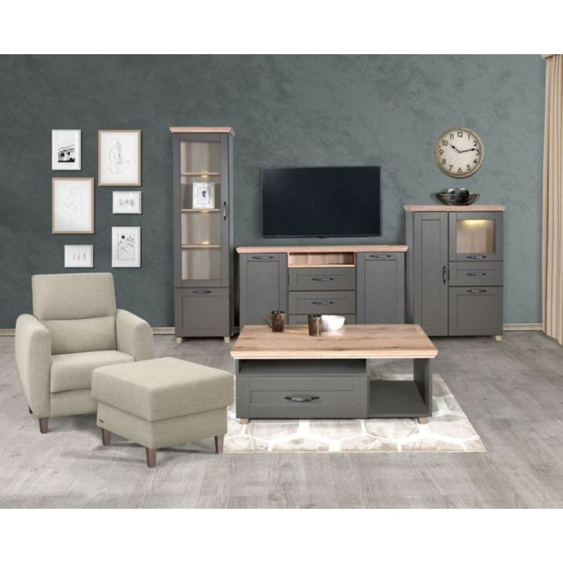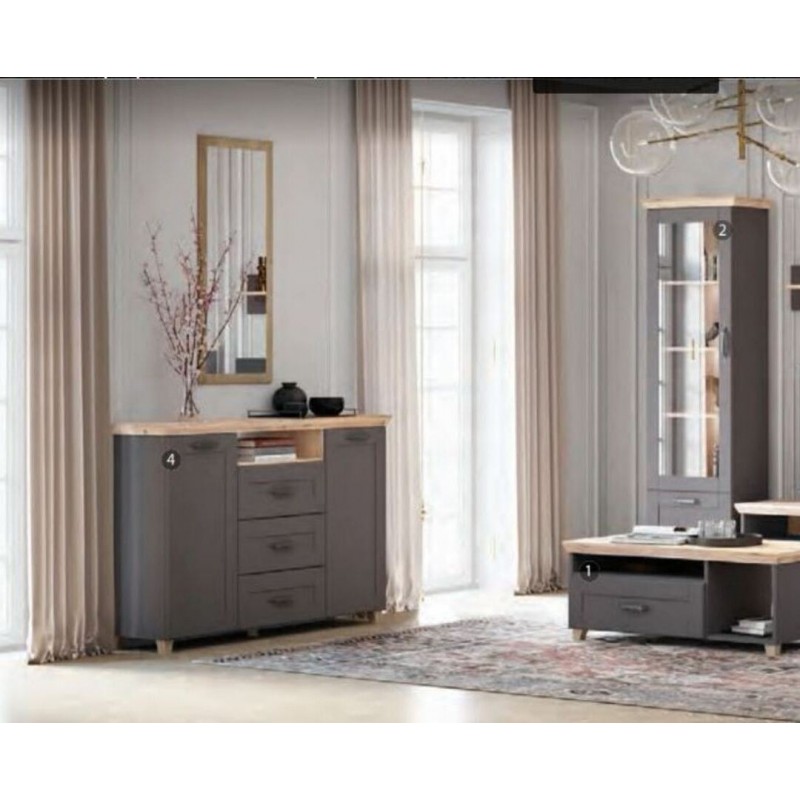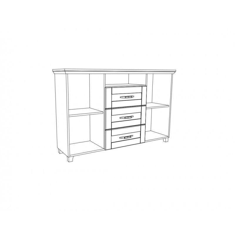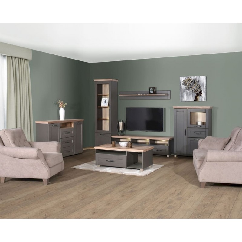 Μπουφές- κομότα σε μοντέρνο Rustikstill, με 2 πόρτεςντουλάπια αποθήκευσης δεξιά και αριστερά, 3 βαθιά συρτάρια στο κέντρο μετηλεσκοπικούς μηχανισμούς και ένα ράφι – κασέτα αποθήκευσης.