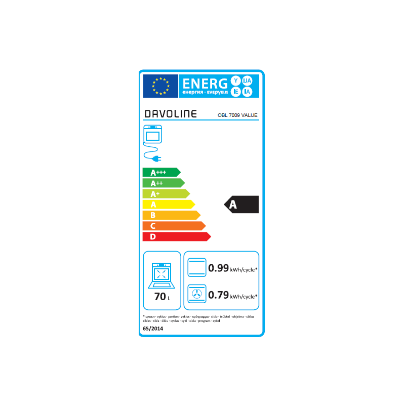 Ο φούρνος διαθέτει ενεργειακή κλάση Α, προσφέροντας εξαιρετική απόδοση με χαμηλή κατανάλωση ενέργειας. Αυτό σημαίνει ότι μπορείτε να απολαμβάνετε άψογα αποτελέσματα στο μαγείρεμα, ενώ ταυτόχρονα μειώνετε την κατανάλωση ρεύματος, συμβάλλοντας έτσι στην εξοικονόμηση ενέργειας και στη μείωση των λειτουργικών εξόδων. Μέσω αυτής της ενεργειακής κλάσης, ο φούρνος συνδυάζει υψηλή απόδοση και οικονομία!