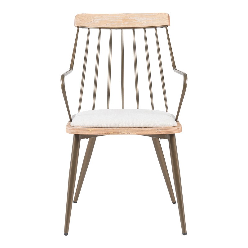 Η πολυθρόνας τραπεζαρίας Posse διακρίνεται για τον εκλεπτυσμένο βιομηχανικό της σχεδιασμό. Διαθέτει ένα άνετο, λεπτό μαξιλάρι καθίσματος , το οποίο πλαισιώνεται από έναν κομψό μεταλλικό σκελετό. Η πλάτη αποτελείται από κάθετες μεταλλικές ράβδους που καταλήγουν σε μια οριζόντια, ξύλινη λεπτομέρεια, προσδίδοντας μια διακριτική αντίθεση. Τα λεπτά, κωνικά μεταλλικά πόδια ενισχύουν την αίσθηση ελαφρότητας και σταθερότητας. Οι καμπύλες μεταλλικές χειρολαβές προσφέρουν επιπλέον άνεση και στυλ.