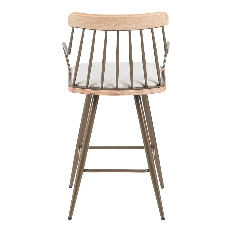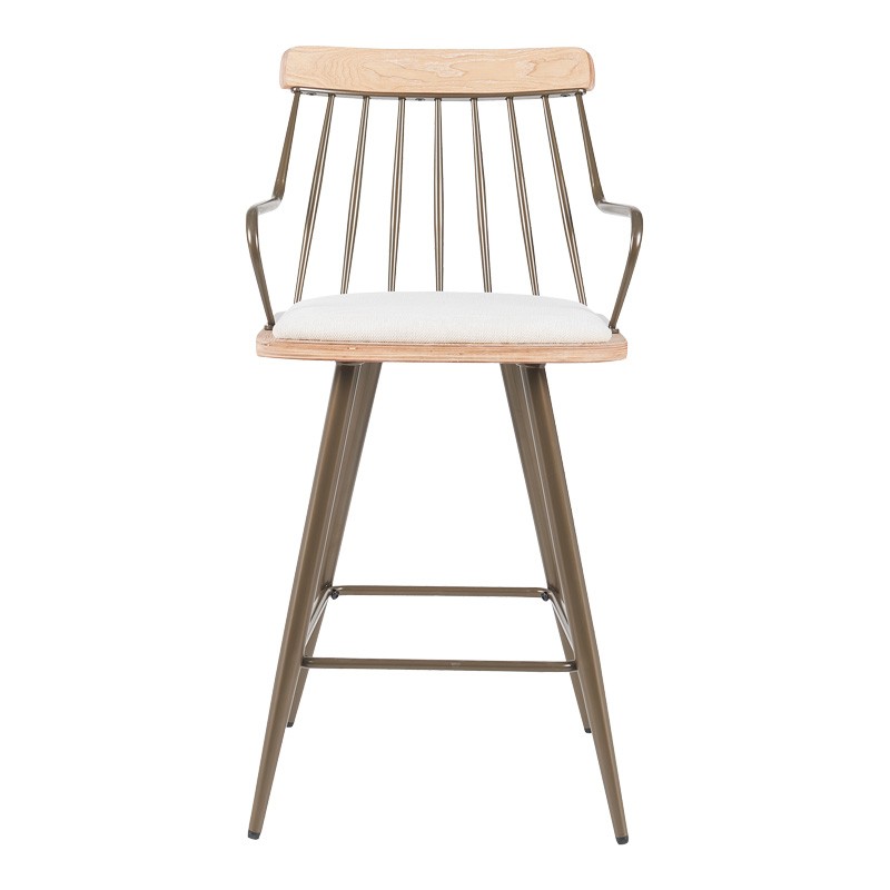 Το κομψό σκαμπό μπαρ Posse συνδυάζει με αρμονία φυσικά και βιομηχανικά στοιχεία. Διαθέτει ένα άνετο κάθισμα πλαισιωμένο από λεπτομέρειες σε ξύλο που προσδίδουν ζεστασιά. Η πλάτη αποτελείται από κάθετες, λεπτές μεταλλικές ράβδους που υποστηρίζονται από ένα οριζόντιο ξύλινο τμήμα στο επάνω μέρος, δημιουργώντας μια ενδιαφέρουσα οπτική αντίθεση. Οι λεπτές μεταλλικές χειρολαβές προσφέρουν άνεση και στυλ. Η σταθερή μεταλλική βάση με τέσσερα κωνικά πόδια και ενισχυτικό κυκλικό στήριγμα για τα πόδια εξασφαλίζει ανθεκτικότητα και λειτουργικότητα.