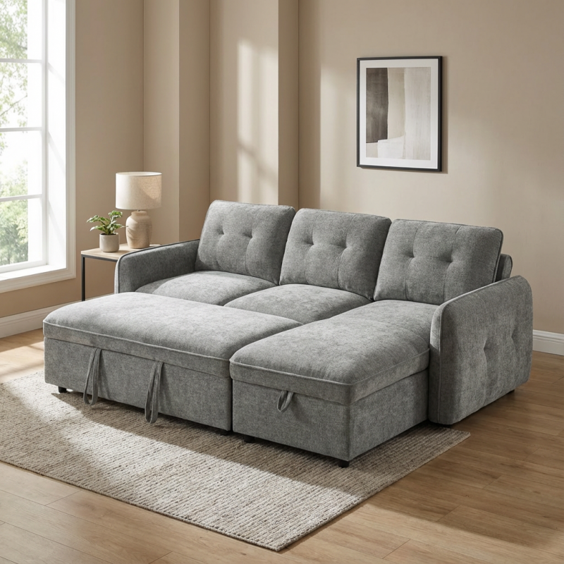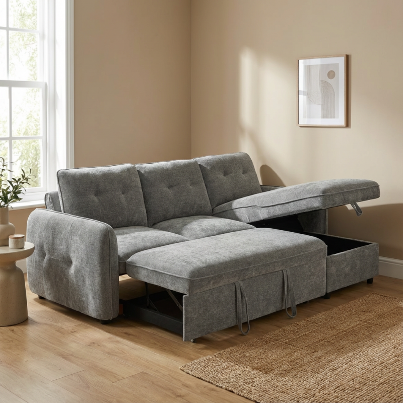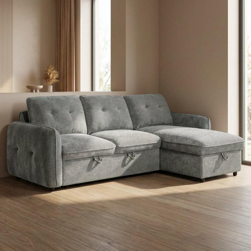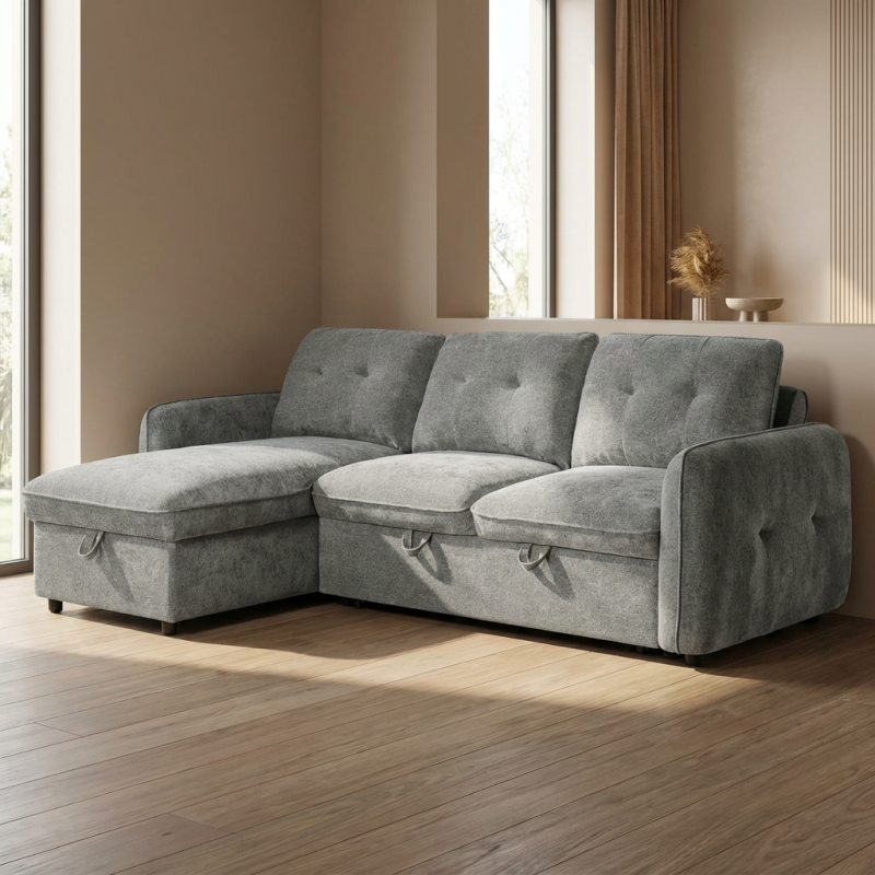 Ο γωνιακός καναπές κρεβάτι Marlon με αποθηκευτικό χώρο αποτελεί ιδανική λύση για σύγχρονα σαλόνια, συνδυάζοντας μοντέρνο σχεδιασμό, άνεση και υψηλή λειτουργικότητα. Με διαστάσεις 232x157εκ. ( ύψος 90 εκ. ) , προσφέρει άνετους χώρους καθίσματος, ενώ η αναστρέψιμη γωνία δίνει ευελιξία στη διαμόρφωση του χώρου, προσαρμοζόμενη εύκολα στις ανάγκες σας. Η επένδυση από ανοιχτό γκρι ύφασμα χαρίζει κομψότητα και ταιριάζει αρμονικά σε κάθε διακόσμηση. Με εύχρηστο μηχανισμό, μετατρέπεται γρήγορα σε άνετο κρεβάτι, ιδανικό για φιλοξενία, ενώ ο ενσωματωμένος αποθηκευτικός χώρος προσφέρει πρακτική λύση για αποθήκευση παπλωμάτων και μαξιλαριών.