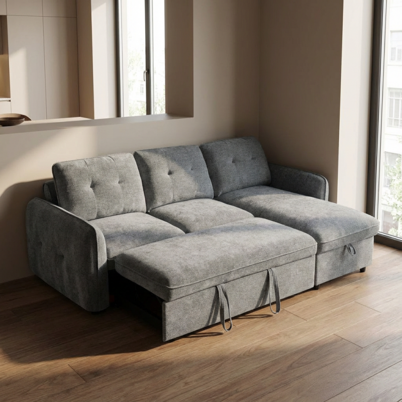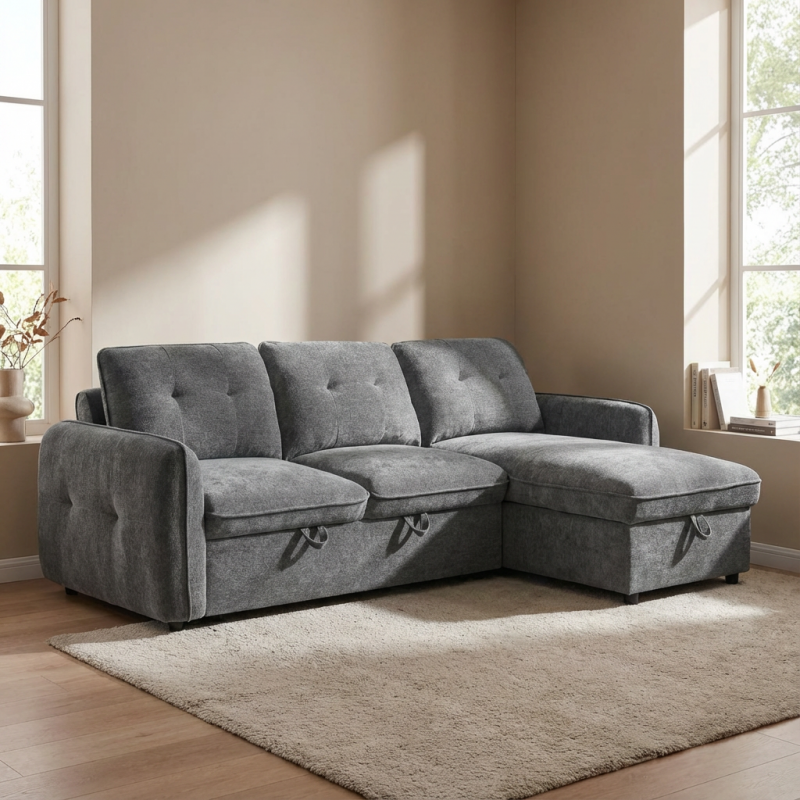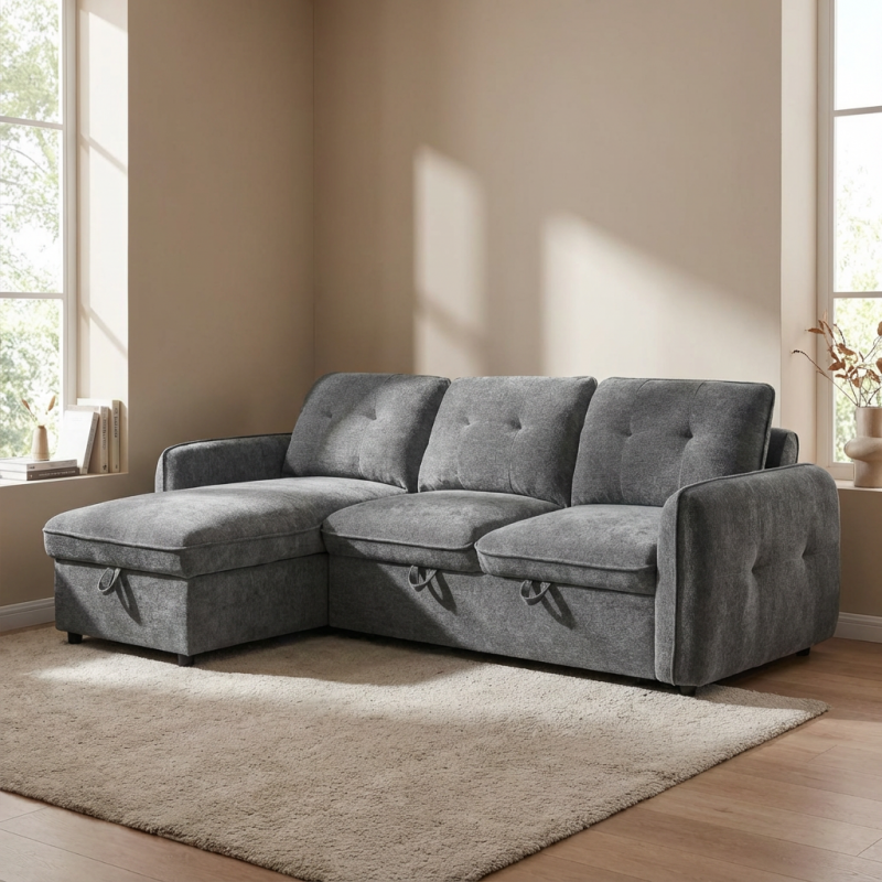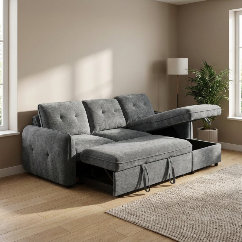 Ο γωνιακός καναπές κρεβάτι Marlon με αποθηκευτικό χώρο αποτελεί ιδανική λύση για σύγχρονα σαλόνια, συνδυάζοντας μοντέρνο σχεδιασμό, άνεση και υψηλή λειτουργικότητα. Με διαστάσεις 232x157εκ. ( ύψος 90 εκ. ) , προσφέρει άνετους χώρους καθίσματος, ενώ η αναστρέψιμη γωνία δίνει ευελιξία στη διαμόρφωση του χώρου, προσαρμοζόμενη εύκολα στις ανάγκες σας. Η επένδυση από γκρι σκούρο ύφασμα χαρίζει κομψότητα και ταιριάζει αρμονικά σε κάθε διακόσμηση. Με εύχρηστο μηχανισμό, μετατρέπεται γρήγορα σε άνετο κρεβάτι, ιδανικό για φιλοξενία, ενώ ο ενσωματωμένος αποθηκευτικός χώρος προσφέρει πρακτική λύση για αποθήκευση παπλωμάτων και μαξιλαριών.