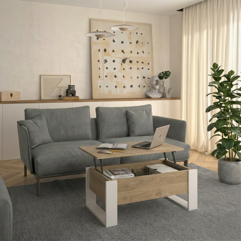 Το τραπεζάκι σαλονιού Denver με σερβιτόρο αποτελεί μια πρακτική και μοντέρνα λύση για το καθιστικό, συνδυάζοντας λειτουργικότητα, εργονομία και σύγχρονο design. Με διαστάσεις 90x52 εκ. και ρυθμιζόμενο ύψος 40/52 εκ., προσαρμόζεται εύκολα στις ανάγκες της καθημερινότητας. Το επάνω μέρος διαθέτει μηχανισμό ανύψωσης με δύο βραχίονες αερίου και μπάρες σταθεροποίησης, εξασφαλίζοντας ομαλή, ασφαλή και σταθερή ανύψωση. Το τραπεζάκι σαλονιού Denver προσφέρει αποθηκευτικό χώρο, ιδανικό για περιοδικά, τηλεχειριστήρια και μικροαντικείμενα. Κατασκευάζεται στη Γαλλία.