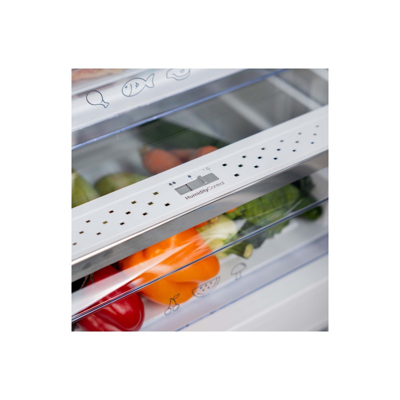 Το συρτάρι φρούτων και λαχανικών διαθέτει ρύθμιση υγρασίας και καλύπτεται με γυάλινο καπάκι, διατηρώντας τα φρέσκα για περισσότερο.