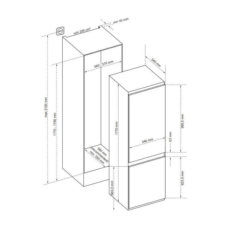 - Διαστάσεις εντοιχισμού (ΠxΒxY) = 56 έως 57 x 55 έως 56 x 177 έως 179 εκ (οι τιμές είναι οι ελάχιστες / μέγιστες επιτρεπόμενες ανά διάσταση)