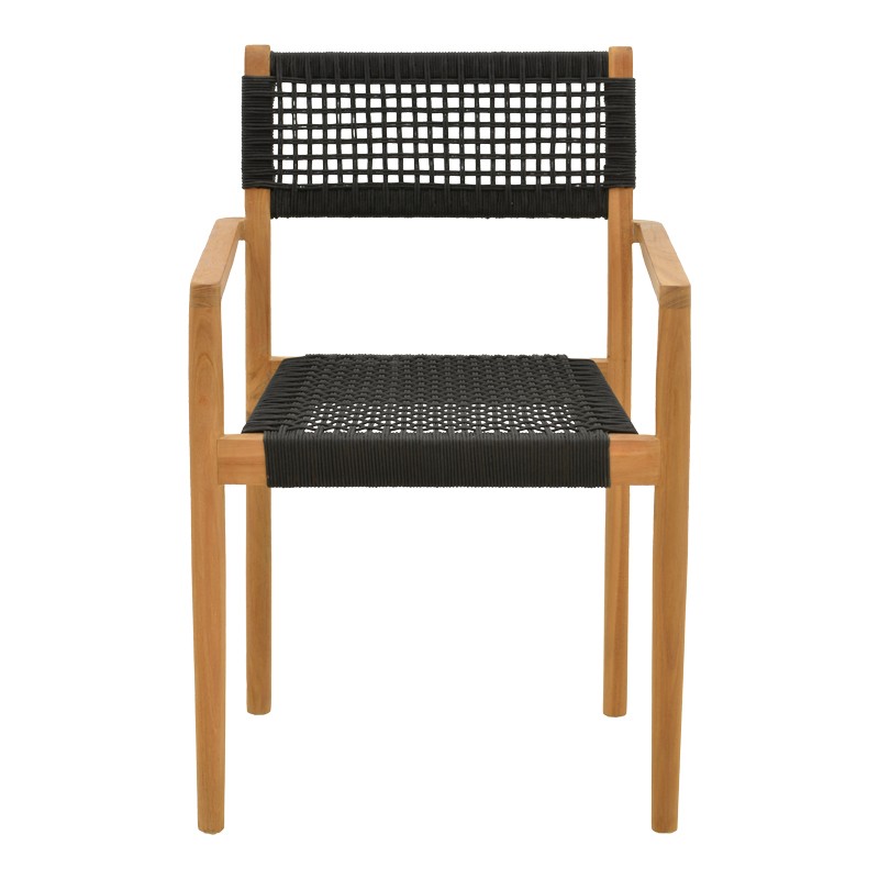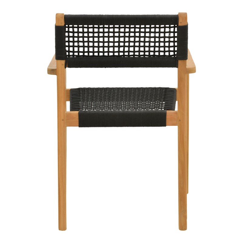 Το κάθισμα και η πλάτη είναι περίτεχνα πλεγμένα με ανθεκτικό σχοινί σε μαύρη απόχρωση, δημιουργώντας ένα ελκυστικό, διαπνέον μοτίβο. Αυτή η λεπτομέρεια όχι μόνο προσθέτει μια μοναδική υφή και ένα φυσικό, ρουστίκ στοιχείο, αλλά εξασφαλίζει και εξαιρετική άνεση, προσαρμοζόμενη στο σώμα.