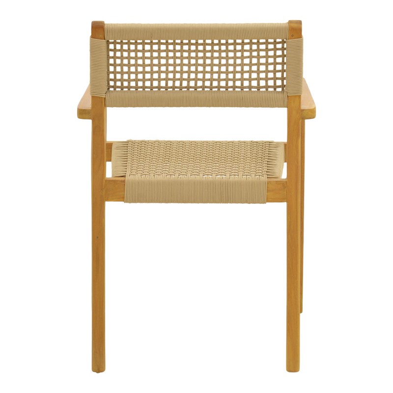 Το κάθισμα και η πλάτη είναι περίτεχνα πλεγμένα με ανθεκτικό σχοινί σε μαύρη απόχρωση, δημιουργώντας ένα ελκυστικό, διαπνέον μοτίβο. Αυτή η λεπτομέρεια όχι μόνο προσθέτει μια μοναδική υφή και ένα φυσικό, ρουστίκ στοιχείο, αλλά εξασφαλίζει και εξαιρετική άνεση, προσαρμοζόμενη στο σώμα.