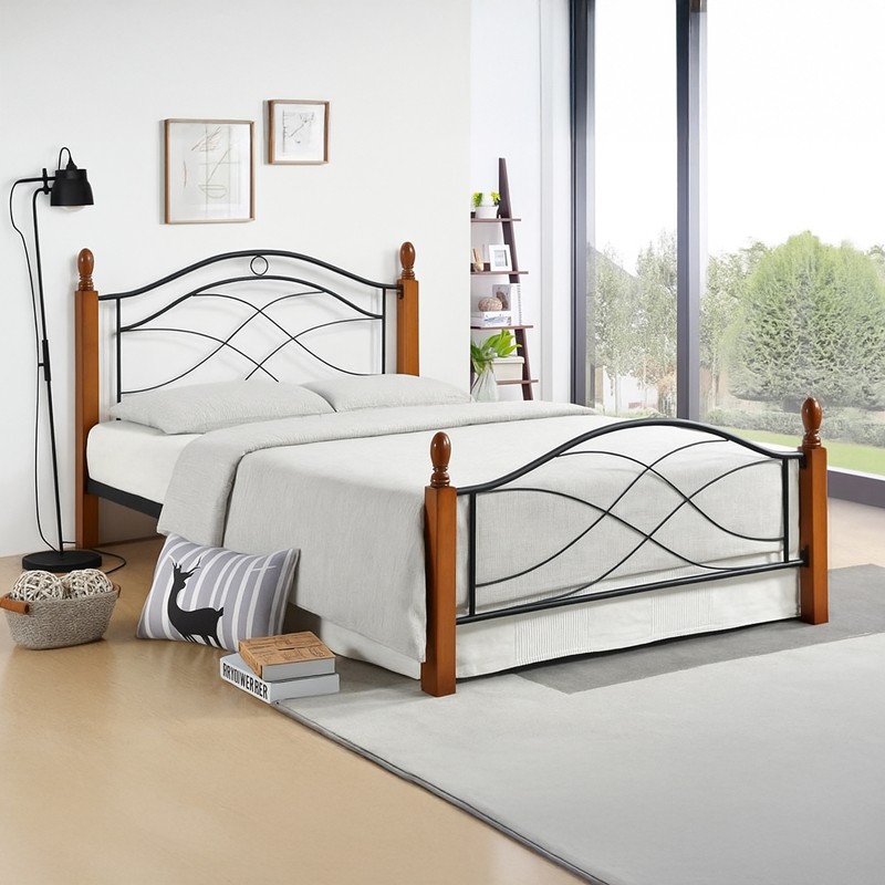 Αναβαθμίστε την κρεβατοκάμαρά σας με αυτό το μοντέρνο και κομψό μονό κρεβάτι, ιδανικό για να προσδώσει μια νότα φινέτσας και ζεστασιάς στον χώρο σας. Η στιβαρή μεταλλική κατασκευή σε μαύρο χρώμα, διακοσμημένη με ένα περίτεχνο σχέδιο στο κεφαλάρι και στο ποδαρικό, συνδυάζεται αρμονικά με τις εκλεπτυσμένες ξύλινες κολώνες σε ζεστό καρυδί τόνο.