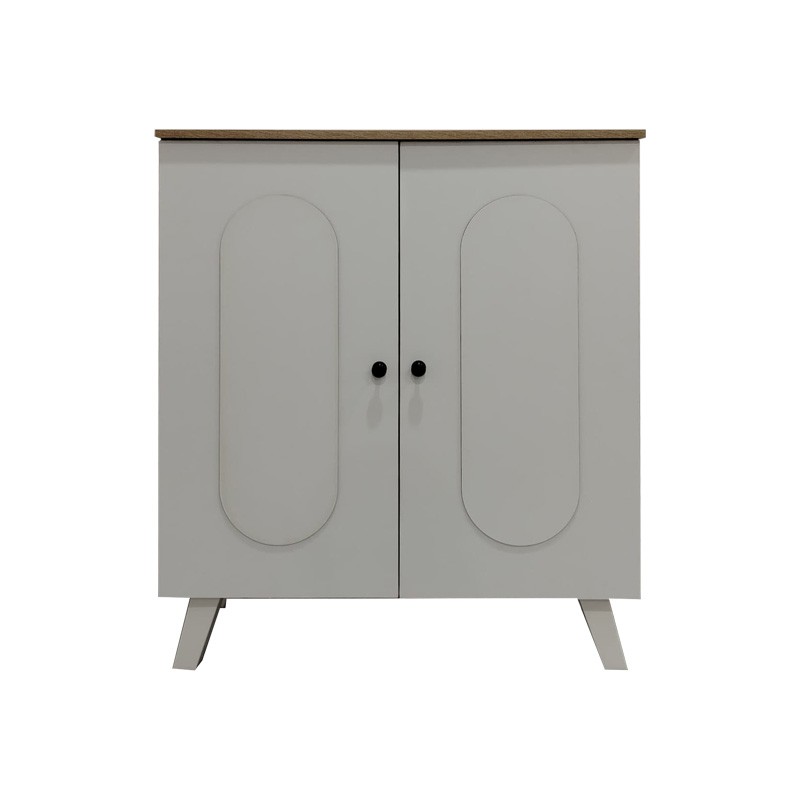 Η κομψή παπουτσοθήκη Cathi συνδυάζει μοντέρνο design με πρακτική λειτουργικότητα. Διαθέτει δύο πόρτες με χαρακτηριστικά οβάλ σχήματα και διακριτικά στρογγυλά χερούλια, προσδίδοντας μια παιχνιδιάρικη αλλά εκλεπτυσμένη αισθητική στον χώρο σας. Το εσωτερικό της προσφέρει αποθηκευτικό χώρο για την τακτοποίηση των υποδημάτων σας. Η χρωματική αντίθεση δημιουργεί ένα ευχάριστο οπτικό ενδιαφέρον. Στηρίζεται σε τέσσερα πόδια που ενισχύουν το μοντέρνο στυλ και προσφέρουν σταθερότητα.