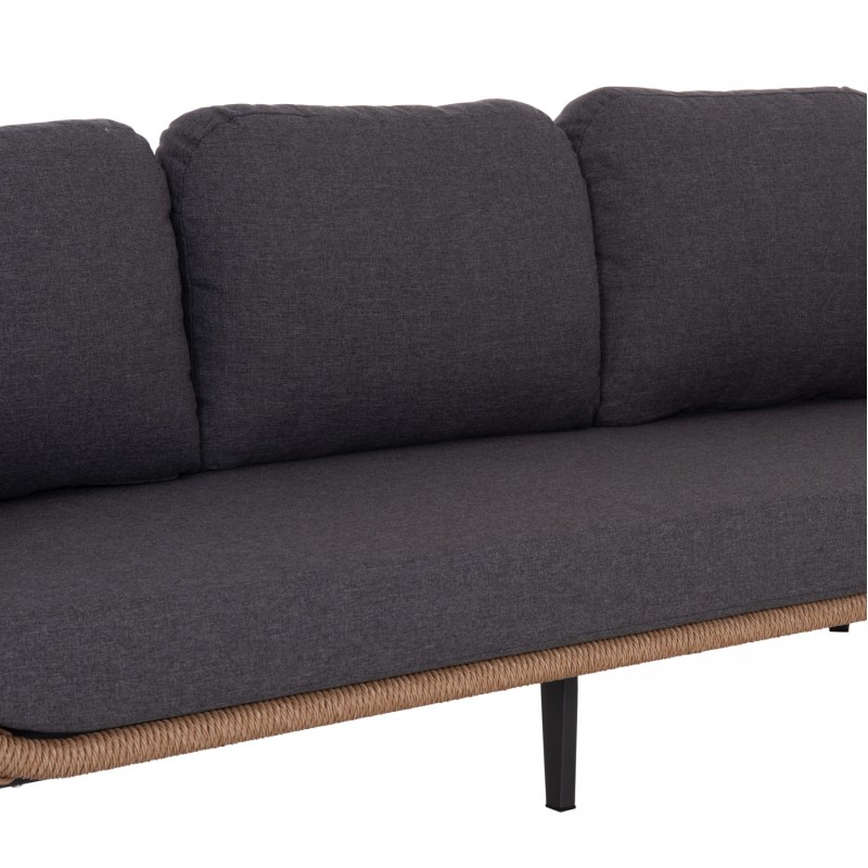 Ο σκελετός από αλουμίνιο σε γκρι απόχρωση, επενδυμένος με twist wicker σε φυσικό χρώμα, προσδίδει φυσική υφή και σύγχρονη κομψότητα. Ο 3-θέσιος καναπές και οι πολυθρόνες διαθέτουν άνετα μαξιλάρια με γκρι πολυεστερικά καλύμματα με φερμουάρ, προσφέροντας ξεκούραση και στήριξη.