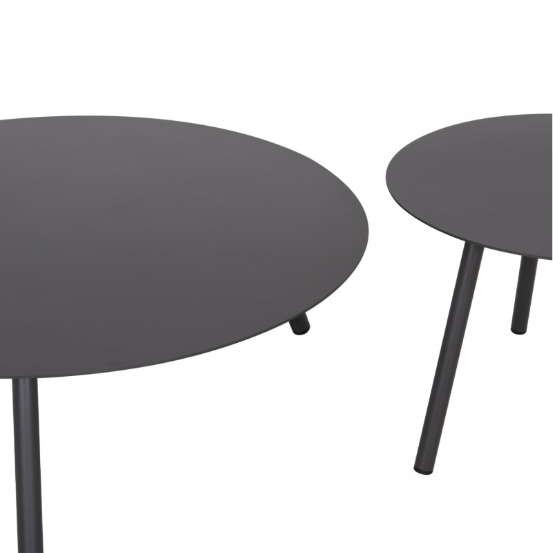 Τα δύο στρογγυλά τραπεζάκια με επιφάνειες αλουμινίου ολοκληρώνουν το σετ, προσθέτοντας πρακτικότητα και minimal αισθητική στον χώρο.
