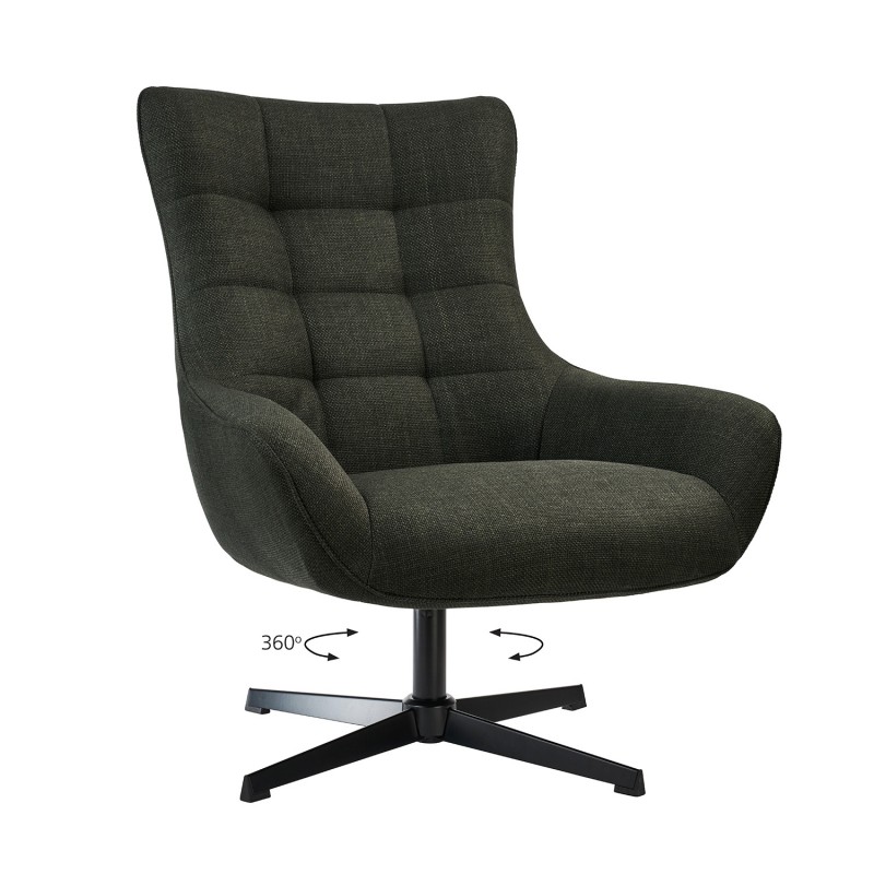 Περιστρεφόμενη πολυθρόνα επενδεδυμένη με ύφασμα και μεταλλικό σκελετό.