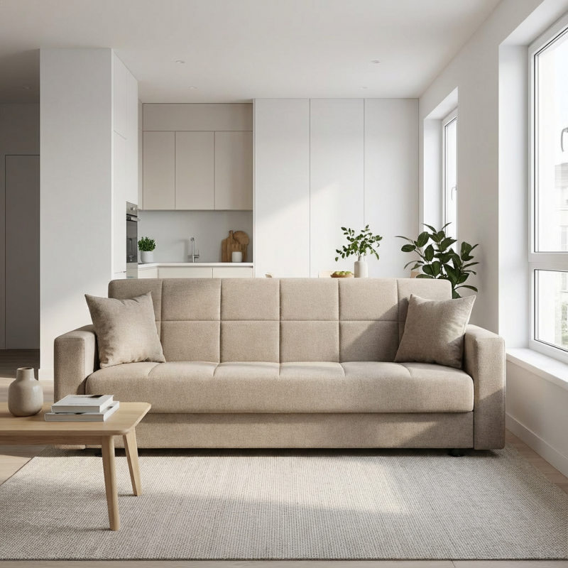 Ο καναπές-κρεβάτι Sebastian συνδυάζει μοντέρνο σχεδιασμό και πρακτικότητα, αποτελώντας ιδανική λύση για καθιστικά και μικρούς χώρους. Διαθέτει διαστάσεις 209x78 εκ. με ύψος 80 εκ. και είναι επενδεδυμένος με μπεζ ύφασμα που ταιριάζει εύκολα σε κάθε διακόσμηση. Με έναν εύχρηστο μηχανισμό, μετατρέπεται γρήγορα σε άνετο κρεβάτι διαστάσεων 103x180 εκ.. Επιπλέον, ο ενσωματωμένος αποθηκευτικός χώρος προσφέρει έξυπνη οργάνωση και εξοικονόμηση χώρου, καθιστώντας τον Sebastian μια ολοκληρωμένη επιλογή καναπέ κρεβατιού με αποθήκευση για το σύγχρονο σπίτι.