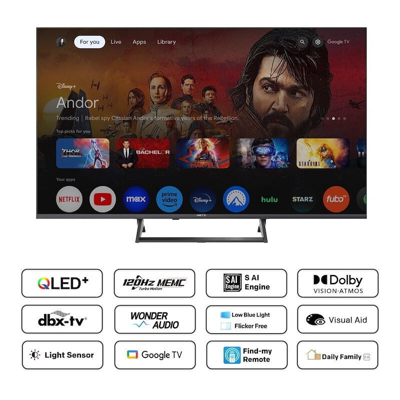 Η τηλεόραση υποστηρίζει πρόσβαση σε πολλές δημοφιλείς εφαρμογές, όπως Netflix και YouTube, προκειμένου να εξερευνήσεις ένα ευρύ φάσμα περιεχομένου. Επιπλέον, διαθέτει λειτουργίες εγγραφής και μπορείς να συνδεθείς στο διαδίκτυο μέσω Wi-Fi ή Ethernet.