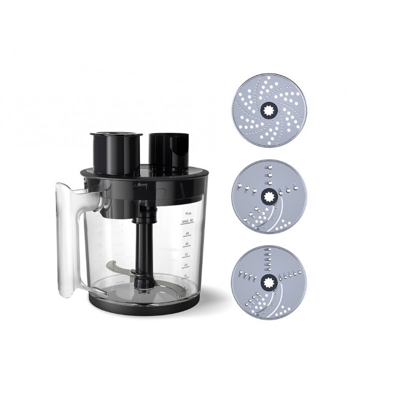 Το εξάρτημα κουζινομηχανής μεγάλης χωρητικότητας 1,7 λίτρων είναι ιδανικό για όλη την οικογένεια. Περιλαμβάνει μια λεπίδα S για το ψιλοκόψιμο μεγάλων ποσοτήτων τροφίμων και τρεις πρόσθετους δίσκους με τους οποίους μπορείτε να κόψετε (σε χοντρές ή λεπτές φέτες), να τεμαχίσετε (σε χοντρά ή λεπτά κομμάτια) ή να τρίψετε υλικά (για πουρέ πατάτας ή τυρί).