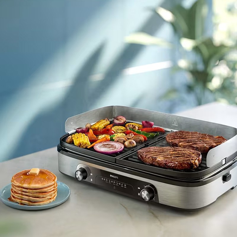 - Δίπλα Πλάκες για Μεγαλύτερη Ευελιξία: Μετατρέψτε τις πλάκες σε τηγάνι ή σχάρα. Μαγειρέψτε τα πάντα – από κρέας μέχρι λαχανικά, αυγά και τηγανίτες.