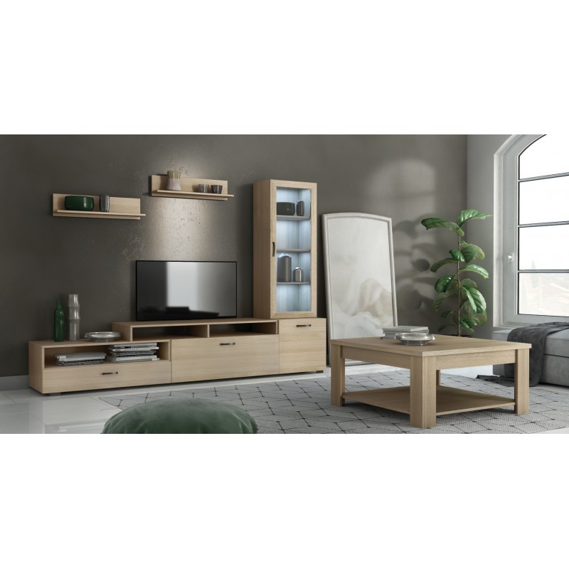 Σετ σύνθετο σαλονιού N28 ,με 1 Βιτρίνα , τρία κουτιά βάσης, μία επιπρόσθετη βάση tv και 2 ράφια τοίχου + Τραπεζάκι σαλονιού N9 χρώματος Λάττε.