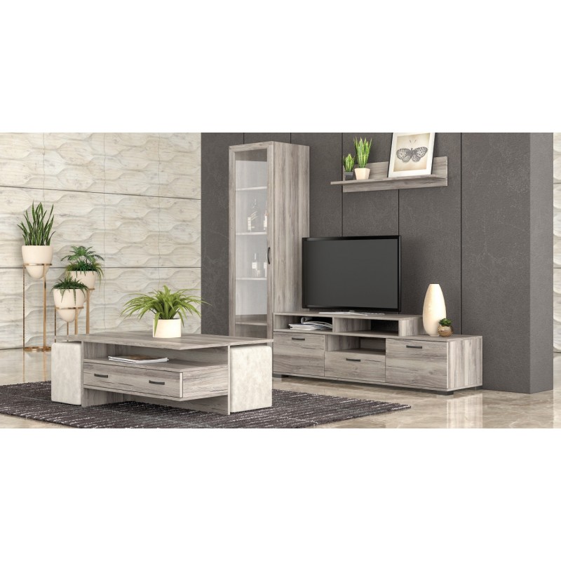 Σετ σύνθετο σαλονιού N29 ,με 1 Βιτρίνα ,1 έπιπλο tv 1,30 ,1 ράφι τοίχου 90cm, 1 επιπρόσθετη βάση tv 1,30cm +Τραπεζάκι σαλονιού πολυμορφικό N3 χρώματος Σταχτί.