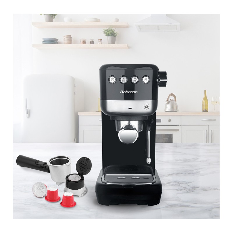 Ημιαυτόματη μηχανή για καφέ espresso, της εταιρείας Rohnson. Η παροχή καφέ γίνεται με αλεσμένο espresso, στο μέγεθος κοπής που εσείς επιθυμείτε.