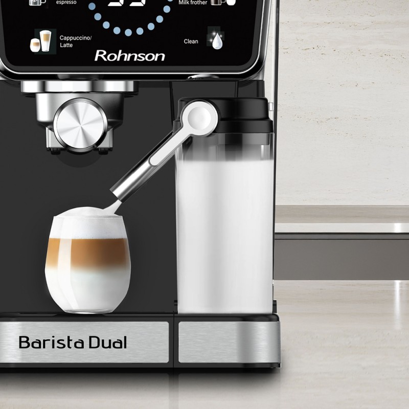 Ανακαλύψτε την απόλυτη εμπειρία καφέ με την Rohnson Barista Dual R-98082, την μηχανή espresso που φέρνει την τέχνη του barista στο χώρο σας – με ένα μόνο πάτημα.