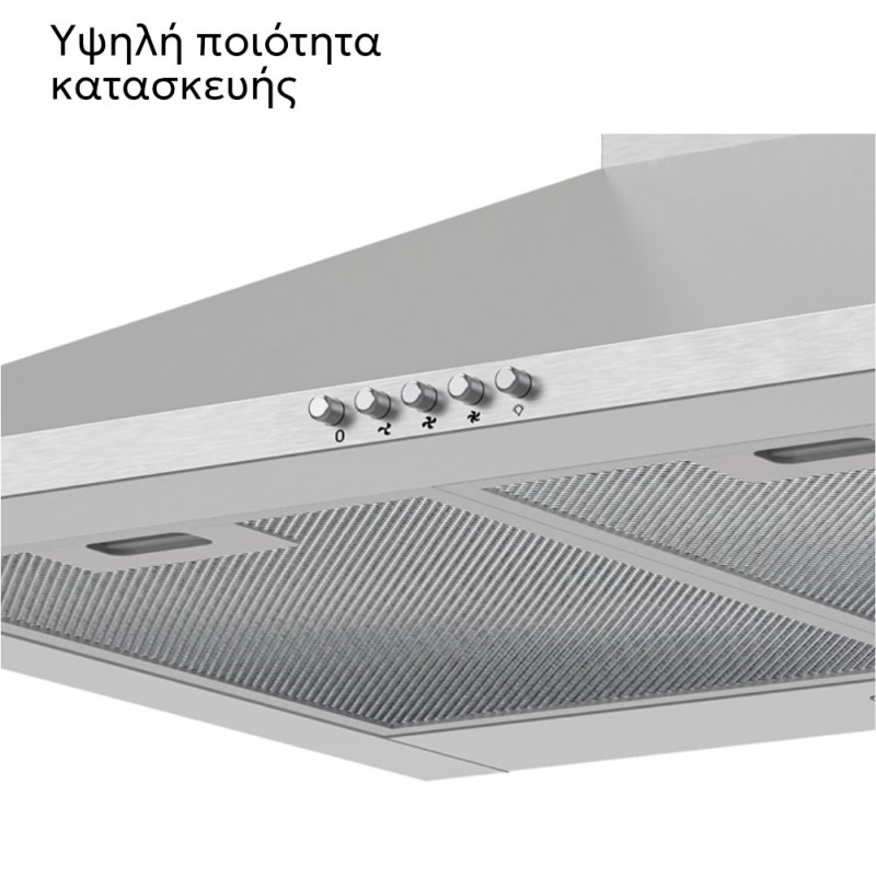 Η συσκευή διαθέτει μοτέρ ισχύος 65W που επιτυγχάνει μέγιστη ροή αέρα 350 m³/h, καλύπτοντας τις ανάγκες μιας μέσης κουζίνας. Ο έλεγχος γίνεται μέσω κουμπιών πίεσης (push buttons), επιτρέποντάς σας να επιλέξετε ανάμεσα σε τρεις βαθμίδες λειτουργίας ανάλογα με την ένταση του μαγειρέματος. Ο φωτισμός LED (2 x 1.5W) εξασφαλίζει τη βέλτιστη ορατότητα πάνω στις εστίες με ελάχιστη κατανάλωση ρεύματος.