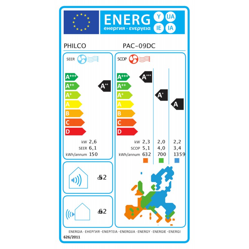 • Στάθμη Θορύβου (dB) εσωτερική/εξωτερική: 52 / 62