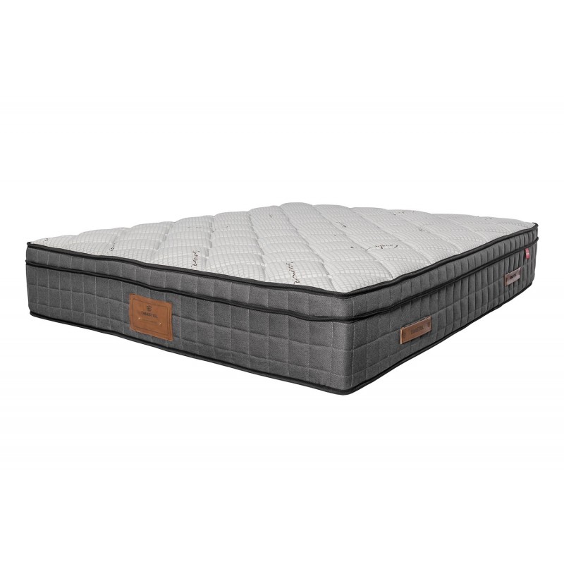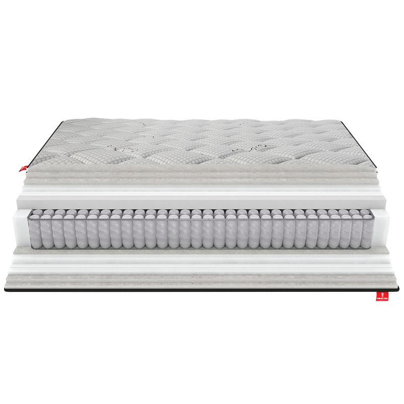 Με ύφασμα από πλεκτό πολυτελές κασμίρ, με στρώσεις από αφρώδη υλικά υψηλής ποιότητας και ανεξάρτητα ελατήρια Pocket ύψους 18 εκ. τα οποία ενισχύονται με ατσάλινο λαμάκι περιμετρικής στήριξης.